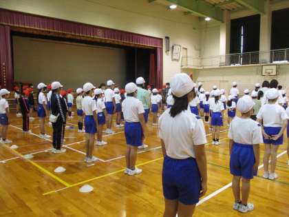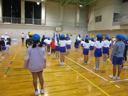 全学年揃って、閉開会式の練習をしました。お兄さんお姉さんに負けないぐらいに元気よく腕を振って行進したり、姿勢を正して先生の話を真剣に聞いたりしました。