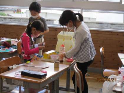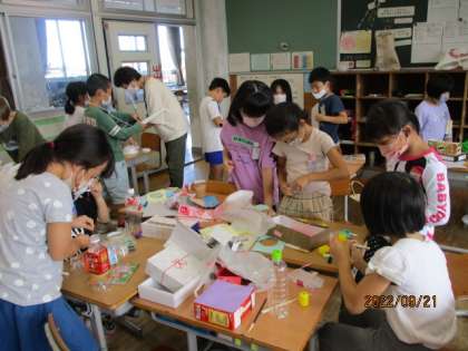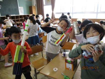 今日も空き箱等を使って、楽器を作りました。トイレットペーパーの芯、輪ゴム、折り紙等、前回より材料を集めてきた子供達。更に工夫を加えていました。