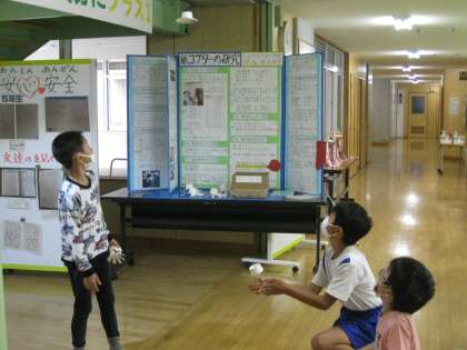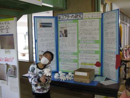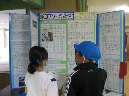 9月23日〜24日に行われた作品展に出品した3年Fさん。夏休みにお家の人と一緒に頑張った「紙コプターの研究」を今、玄関エントランス広場に展示して、ふるさとっ子のみんなに見てもらっています。