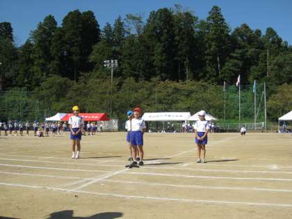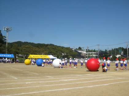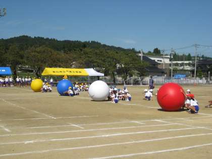 プログラム9番。1・2・3年の「なかまにつなげ!大玉ころがし」です。