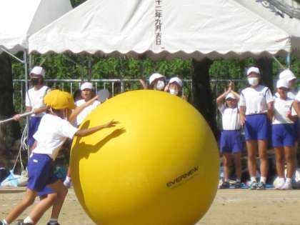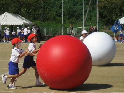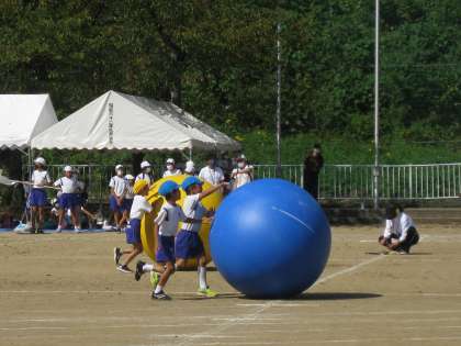 どの団も、ペアで協力し、大きな玉を向こうまで渡します。横から前を見る人。正面から思い切り転がす人。分担したり、ペアで右左同じくらいの力で運んだりと工夫しています。