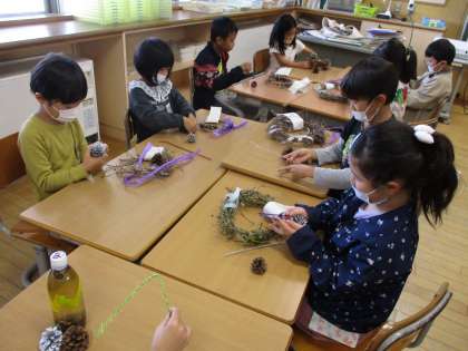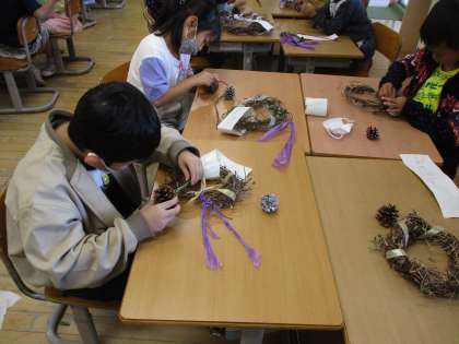 1学期から大切に育てたあさがおでリースをつくっています。リボンやまっぼっくりを飾り付けて素敵なリースに仕上がってきています。