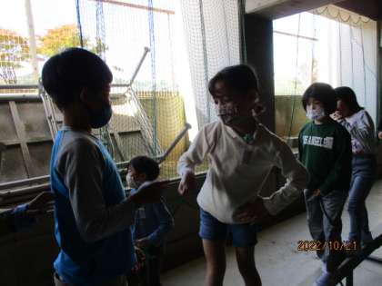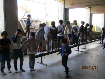 早速、係活動の計画を行動に移すチームが表れました。「ピロティで平均台ジャンケンをしませんか」と呼びかけました。この日は、1年生も加わって、笑顔が広がりました。
