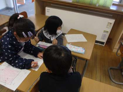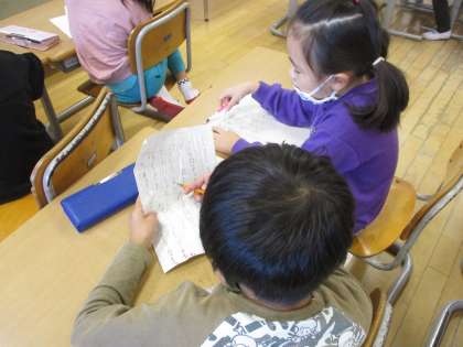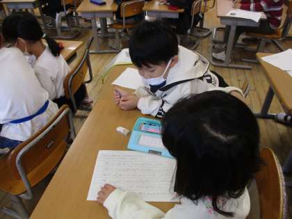 国語科の学習で、「自分の宝物」についての文章を考えています。今日は、担任の宝物についての文の並び替えをしながら、「相手が読みやすい文の順番」について考えました。「色は色、形なら形で続けて文を書くと分かりやすいね」「思ったことは最後に書くといいよね」など、文の順番の大切さに気付きました。