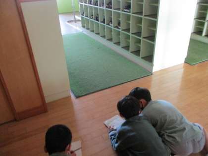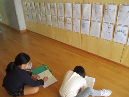 算数科で、学校の中から、かけ算で表せる場面を探しました。下足箱の数は、1列に3こずつ、10列あるから、3×10で、30」等、ロッカーや掲示物の数を式に表しました。身の回りにたくさんのかけ算の場面があることに気付き、びっくりしていました。