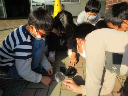 理科の学習では、虫眼鏡を使い、日光を集めて実験をしました。「けむりが出てきた!」「もっと近づけてみたら?」「穴が開いてきたよ!」と、太陽の光の力で紙が焦げることに驚いていました。