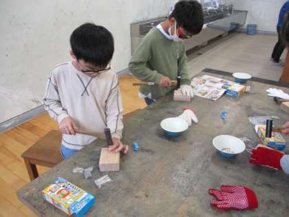 図工の時間には、図工室でリズムのよい音が響いていました。金づちで、思い思いに釘をうって作品をつくりました。