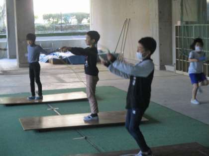 1・2年生は、ピロティで練習しています。ジャンピングボードを仲良く使っていました。