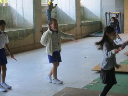 朝の「くらしの時間」には、縄跳びの練習に取り組む子供が増えました。先日、生山ヒジキ先生の縄跳び教室で、いろいろな技やコツを教えてもらいました。交差跳びができるようになった子供が、どんどん難しい技に挑戦しています。