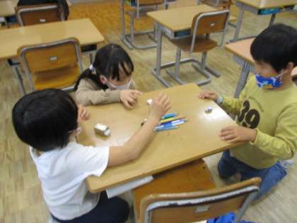 今日ののびのびタイムでは、いろいろな遊びで楽しんでいました。お店屋さん(係活動)主催の手作りルーレット遊び、消しゴムを使っての遊び、生活科の動くおもちゃのバージョンアップ等、工夫を凝らして遊んでいました。