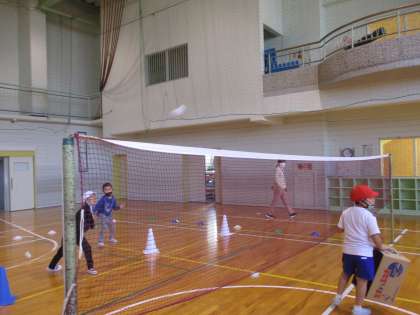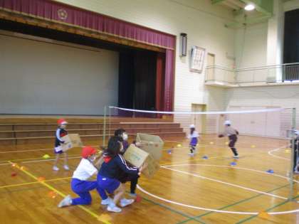 ネット型形式で、ボール投げゲームを学習しています。相手のいないところに上手にボールを投げることができるように、ボールがネットに当たらないように、投げる方向を考えながらボールを投げていました。