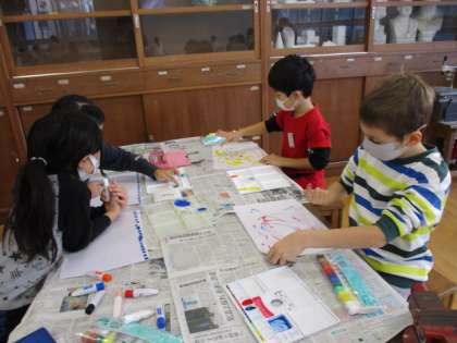 今日の図工は、指に絵の具を付けて絵を描きました。絵の具の感触を楽しみながら、製作に取り組みました。