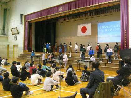 予定通り、式が始まりました。全校みんなで、いい雰囲気をつくって校長先生のお話や発表を聞いていました。