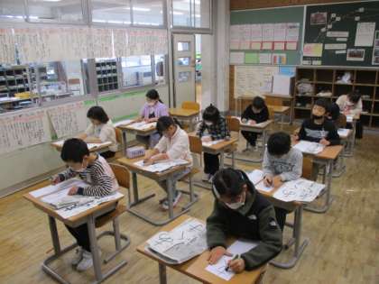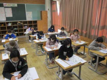 始業式の後は、書き初め大会を行いました。冬休みに練習した成果を発揮しようと、姿勢に気を付けて、丁寧に書きました。
