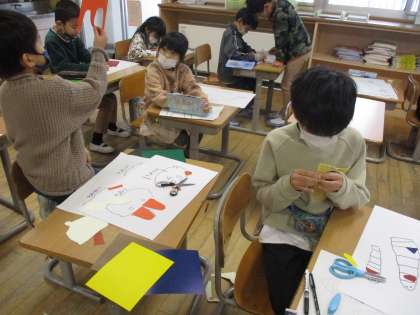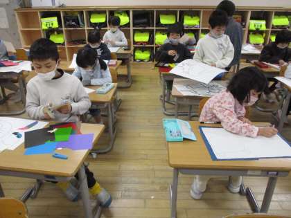 図画工作科で、紙版画の学習をしています。自分の好きな生き物や国旗などをカラーシールで表現しました。今から完成が楽しみです。