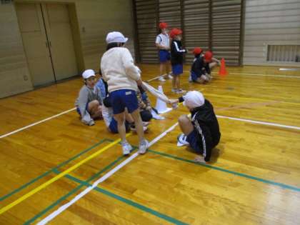 体育科では、いろいろな運動に挑戦しています。アザラシやうさぎの動きをまねて移動する「動物に変身」、長い紙テープの端を床に付けないように走る「たこあげ走」、ぞうきんに乗った友達を引っ張る「空飛ぶじゅうたん」等です。体のどの部分に力を入れればよいかを考えながら、スムーズに動くコツを見つけていました。