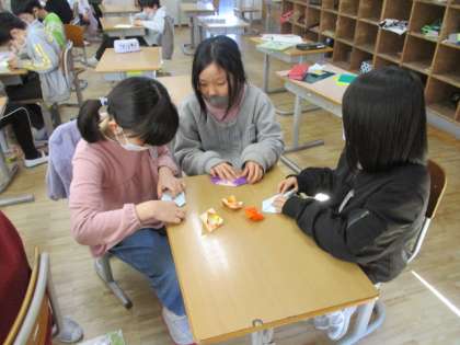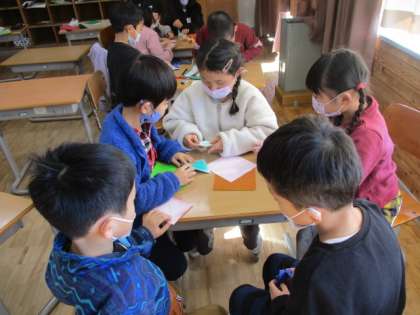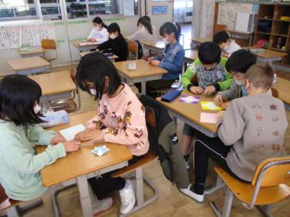 8の字跳びの後、1年間リーダーとして、斑を引っ張ってくださった6年生にメダルを贈ります。リーダーの顔を思い出しながら、折り紙を丁寧に折りました。