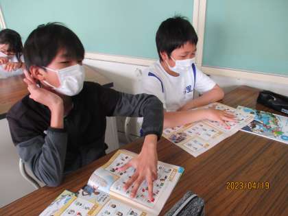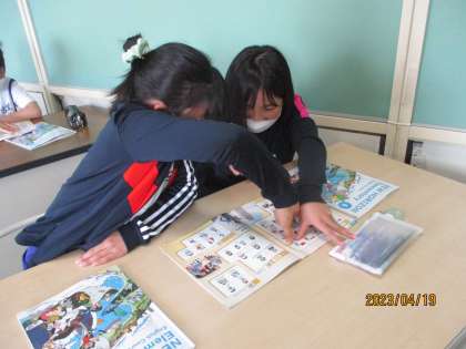 英語の時間に新しく国名を学習しました。「ガーナ」「コリア」「ペルー」等、聞き慣れない英語での国名や発音に戸惑いつつも、指示された国を探して五本の指で押さえるというゲームを通して楽しみながら学んでいました。