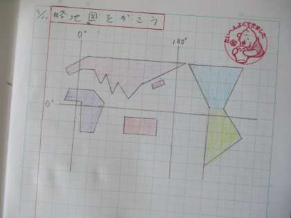 社会では、国土の学習をしています。今日は、世界の略地図をかきました。難しいですが、ポイントを押さえながらかいていました。上手ですよ。六大陸と三海洋の名前と位置もばっちり覚えたようです。