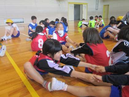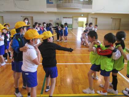 1年生と一緒に、かもつ列車やまねっこダンス、ストレッチなどして体を動かしました。