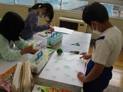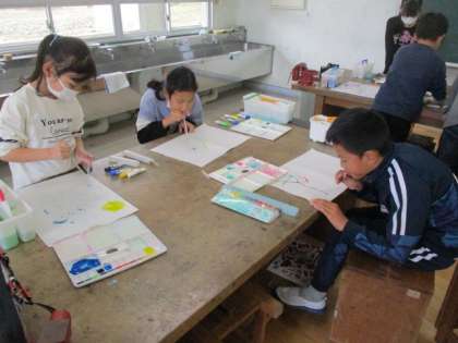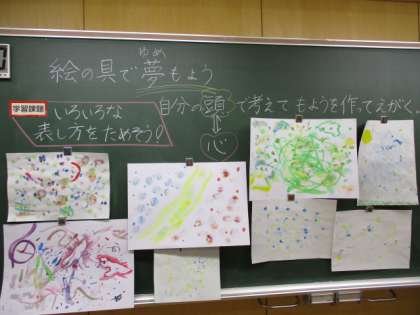 図工では、「絵の具で夢もよう」の学習をしました。画用紙の上の絵の具をストローで吹いたり、歯ブラシと網を使って描いたりするなど、いろいろな表現方法を試しました。