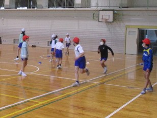 新色団での活動です。リードを取ってバトンの受け渡しをできるように練習しています。バトンを渡す人と受け取る人の距離を、歩数を使って決めます。「10歩の距離に来たらスタートしよう」「受け渡しがうまくいかないから、距離を縮めてみよう」などと、お互いがトップスピードでバトンを渡すことができるように、何度も試していました。