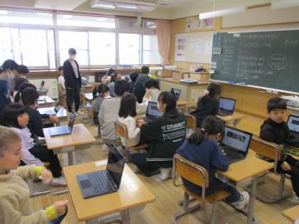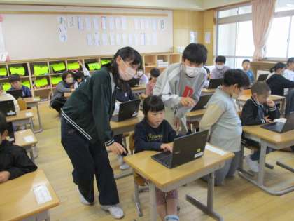 今日は初めてクロームブックを使いました。6年生さんに使い方を教えてもらいながら、簡単なアンケートに答えました。1年生は初めてのクロームブックに興味津々で取り組んでいました。これから少しずつ慣れていこうね!