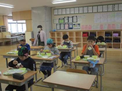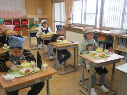 今日の給食はブイヤベースやクロケットなど、フランス発祥の料理を楽しみました。静かに給食を味わいつつも、ブイヤベースの中のホタテや揚げ物に喜んでいる様子も見られました。