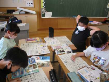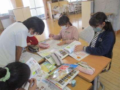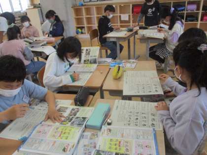 社会科では、日本国憲法の3つの原則についてワークシートにまとめました。教科書や資料集を使って調べたり、教え合ったりしながら学習を進めていました。
