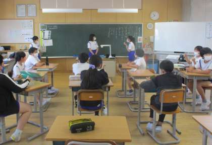 宿泊学習に向けて、キャンプファイヤーの出し物について話し合いました。学年目標の「糸支(つながり)」を意識しながら、全員参加できる出し物は何かを学級ごとに考えていました。