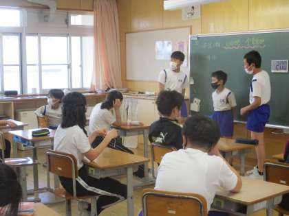 宿泊学習に向けて、キャンプファイヤーの出し物について話し合いました。学年目標の「糸支(つながり)」を意識しながら、全員参加できる出し物は何かを学級ごとに考えていました。