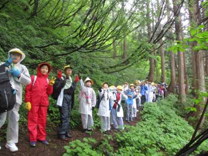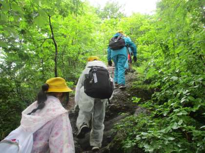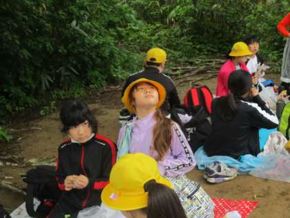 来拝山登山では、急な岩場や滑りやすいところで「掴みやすい木の枝があるよ」「ここ滑りやすいから気をつけて」「がんばれ」など登り方のこつや励まし合う声かけをしていました。頂上ではお弁当を楽しんだり、珍しい虫を見たりしていました。