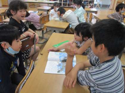国語科では、スイミーを学習しています。「たくさんの兄弟達と遊んで、スイミーは楽しそう」「大きなまぐろが来たとき、とても怖かったと思うな」など、文章や絵から登場人物の気持ちを考えています。