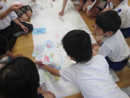 スイミーが海の中で見付けた素晴らしいものを、みんなで描き、大きな紙を海と見立てて貼りました。次回は、子供たちが作った大きな海を使って、登場人物の気持ちを考えます。