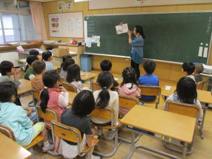 読み聞かせボランティアの方に読み聞かせをしてもらっています。楽しいお話に引き込まれるように、集中して聞いていました。