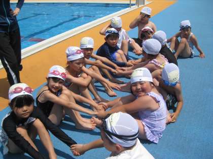 プール開きの後、すぐに6年と1年とで仲良くプールに入りました。まずは、準備体操。その次はバディーの相手を覚えました。