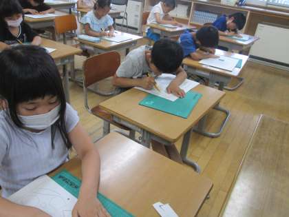 図画工作科では、カッターを使って自分の好きな形を切り抜いています。カッターの持ち方や刃先の向きなどの約束をしっかりと守って、慎重に切り抜いています。