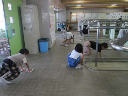 生活科で毎日畑に行っている子供たち。玄関が畑の泥で汚れてしまった日はみんなで玄関掃除をしました。