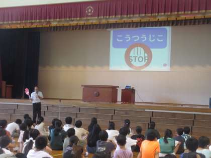 終業式、授賞式の後、生徒指導担当の先生から「夏休みの生活」についての話、体育活動担当の先生から「夏休みのプール開放」についての話がありました。