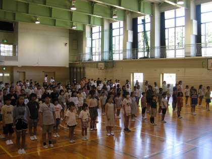 朝一番に体育館で始業式を行いました。校長先生のお話を考えながら聞き、6年1組の2学期への意気込みの発表を見て、校歌を歌いました。