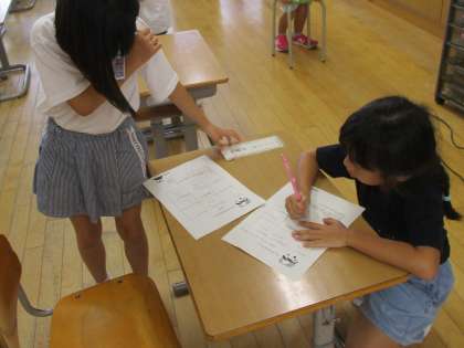 久しぶりの友達と会えてうれしそうな1年1組の子供達でした。夏休みの思い出ビンゴをして、友達と休み中の様子を伝え合いました。