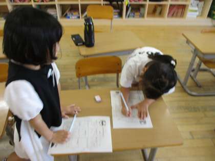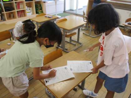 久しぶりの友達と会えてうれしそうな1年1組の子供達でした。夏休みの思い出ビンゴをして、友達と休み中の様子を伝え合いました。