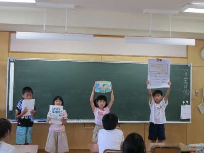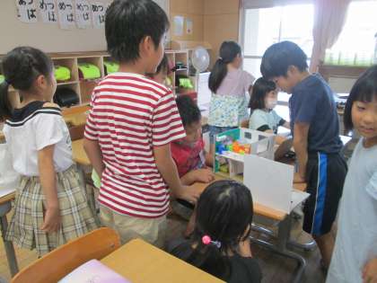 夏休みに頑張ったことや自由研究・工作などをクラスで発表しました。友達の作品を見たり触ったりして、友だちの頑張りを認め合いました。