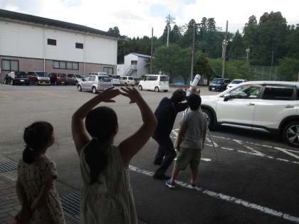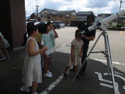 理科では、月の動きを調べていきます。校長先生が望遠鏡を用意してくださいました。この日は、大きな雲に月が隠れる時間も多かったのですが、雲の切れ間を見計らって見ることができました。