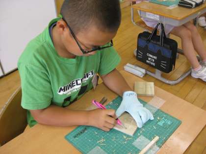 彫刻刀で木の板に何やら文字を彫っています。みんなの文字が合わさると何ができるのでしょうか?今、全校児童で一つの物を作っています。分かるのは11月終わりの予定です。
