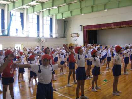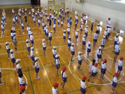 今日は体育館に全校で集まり、開会式の練習を行いました。入場行進、昨日リモートで学んだラジオ体操と運動会の歌の練習を行いました。