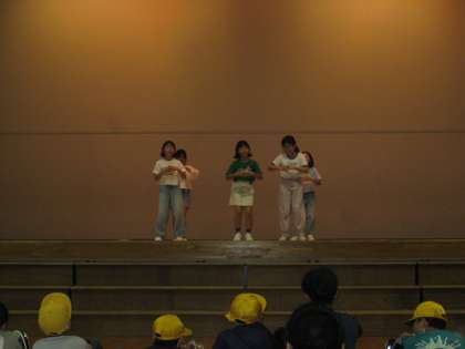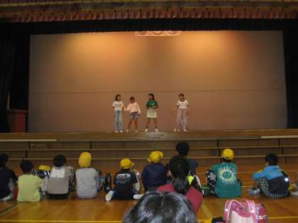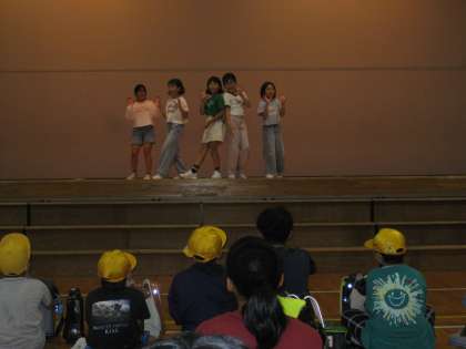 いつものように、生徒指導担当の先生や地区児童会担当の先生からの話だけではなく、4〜6年生が楽しんで活動しているクラブのミニ発表もありました。「みんなにみてもらいたいです!」と、音楽クラブ担当の先生にお願いしたら、実現したそうです。今日は、発表メンバーの6年生が欠席で急きょ、フォーメーションを変えたみたいですが、楽しそうに踊る姿に全校児童のみんなから、温かい拍手をもらい、嬉しそうでした。