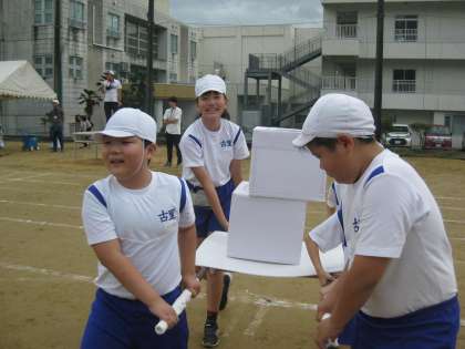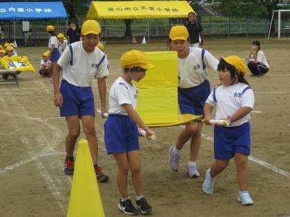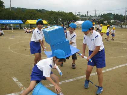 全校での団体競技。今年は創立150周年という節目の年。スマイル班で協力して神輿をかつぐ要領で荷物を運びます。何度か練習しましたが、楽しいようで、「またしたい」と言っています。