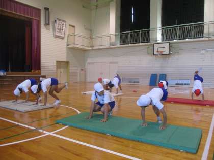 後転や側方倒立回転、倒立等の基本的な技のポイントを教えていただきました。たくさんの「できた!」という声や表情から、楽しさ、うれしさを感じました。