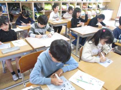 書写の学習で水筆を使って、字を書きました。いつも以上に「とめ・はね・はらい」を気を付けて書いていました。